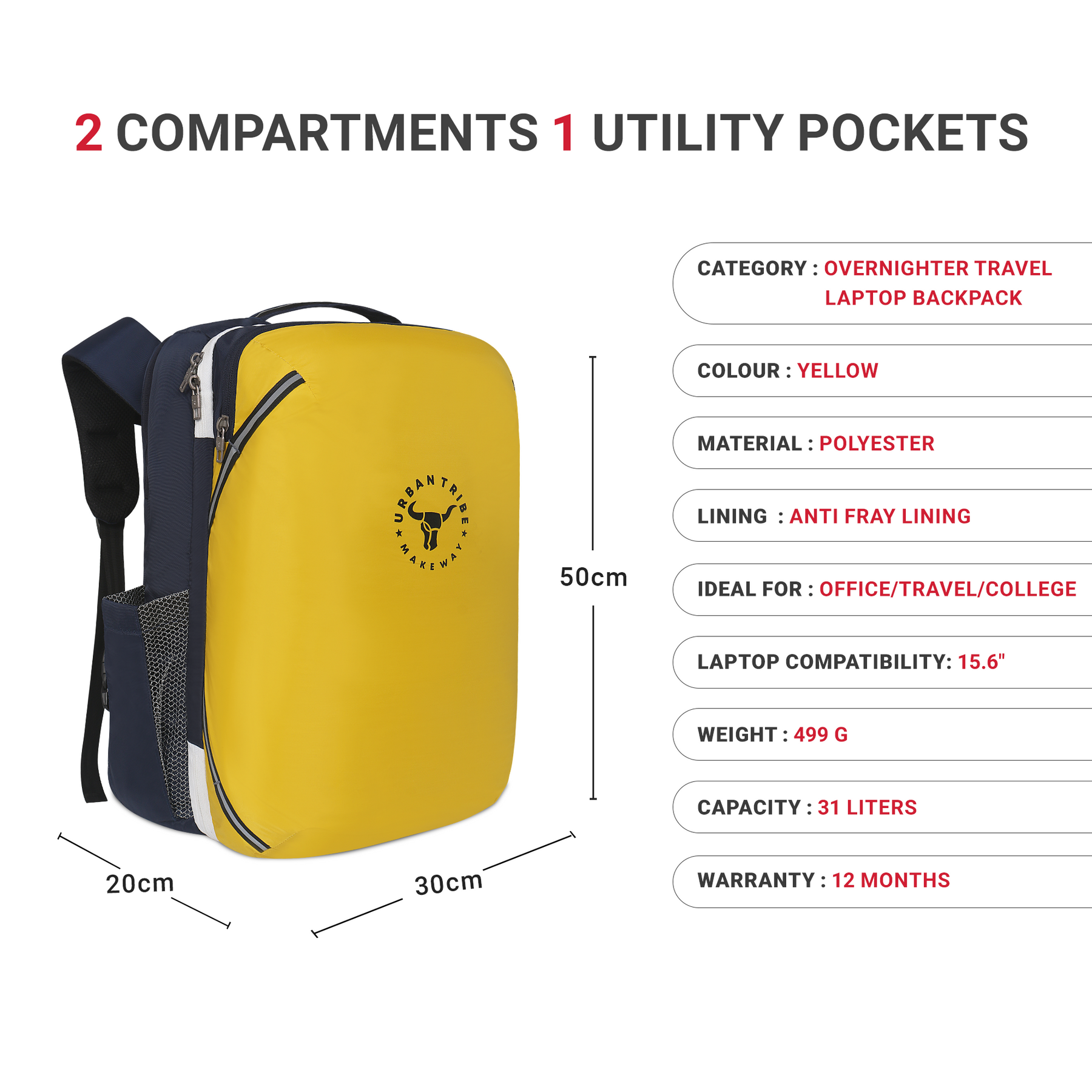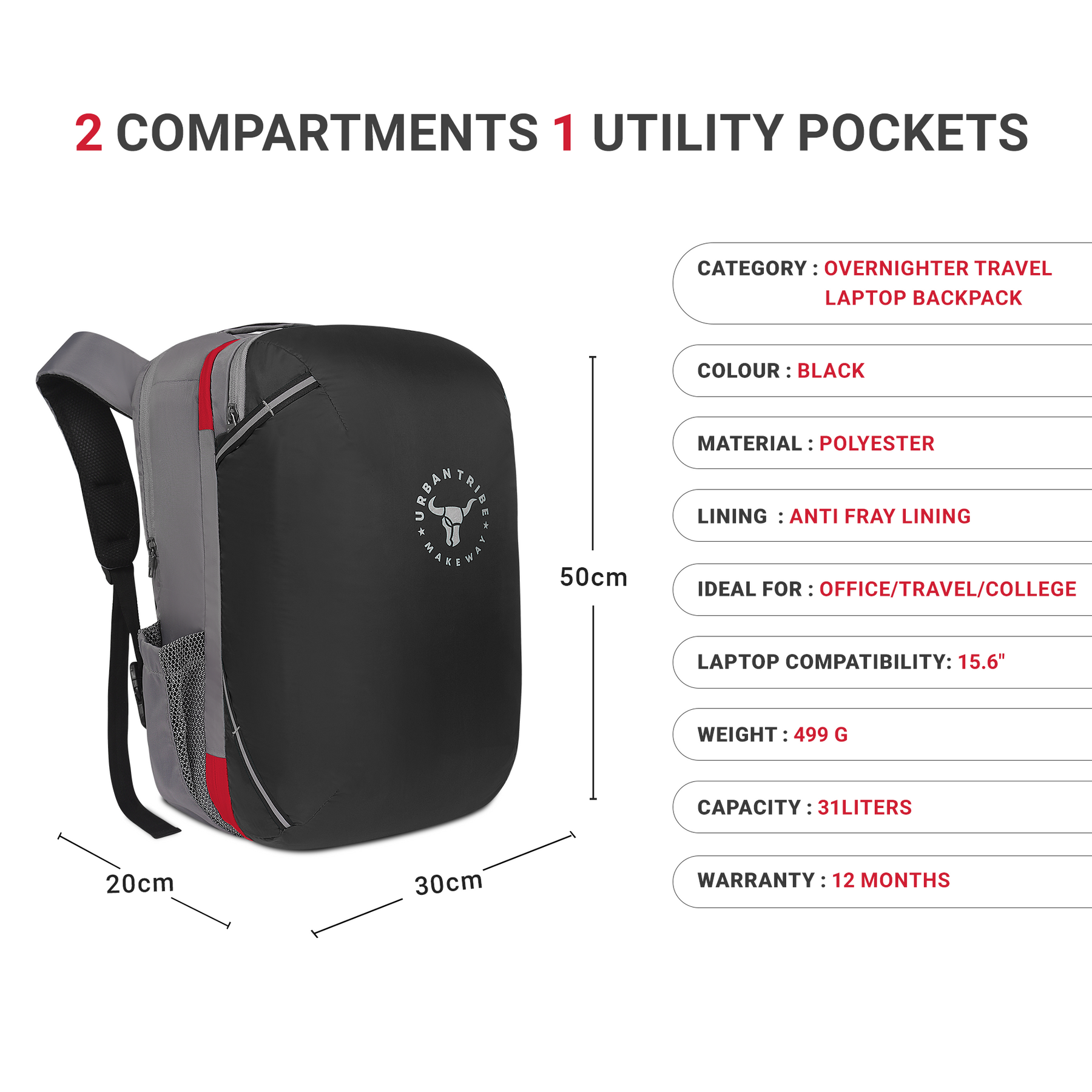 URBAN TRIBE Amigo 31L Overnighter Travel Laptop Backpack with Suitcase Compartment